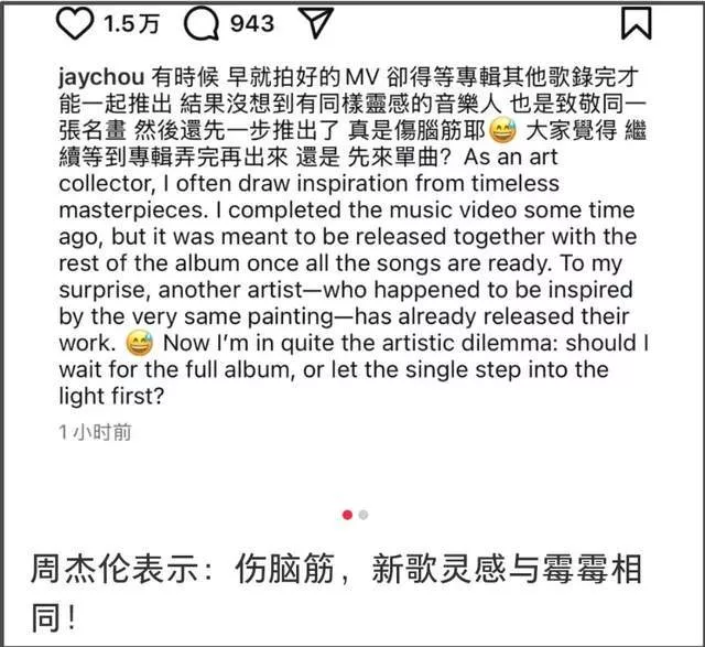 周杰伦本人在个人社媒连发两条动态,感慨自己和霉霉新歌撞了灵感,他的原话是:有时候早就拍好的MV,却得等专辑其他歌录完才能一起推出,结果没想到有同样灵感的音乐人,也是致敬同一张名画,然后还先一步推出了,真是伤脑筋耶。大家觉得继续等到专辑弄完再出来,还是先来单曲?