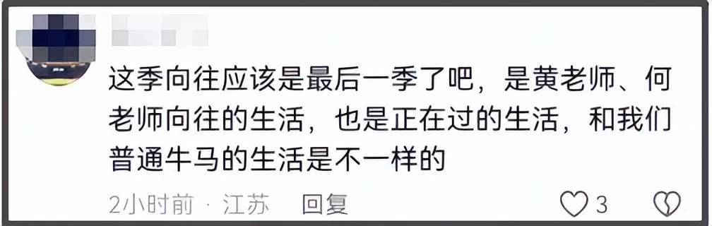 而今,节目组和黄磊等都不演了,不仅大肆更改《向往的生活》主题,还彻底让它成为一档赤裸裸的宣传节目,展示的不再是普罗大众期待的平凡的生活,而是黄磊、何炅们的明星日常,以及他们向往的生活,观感差。