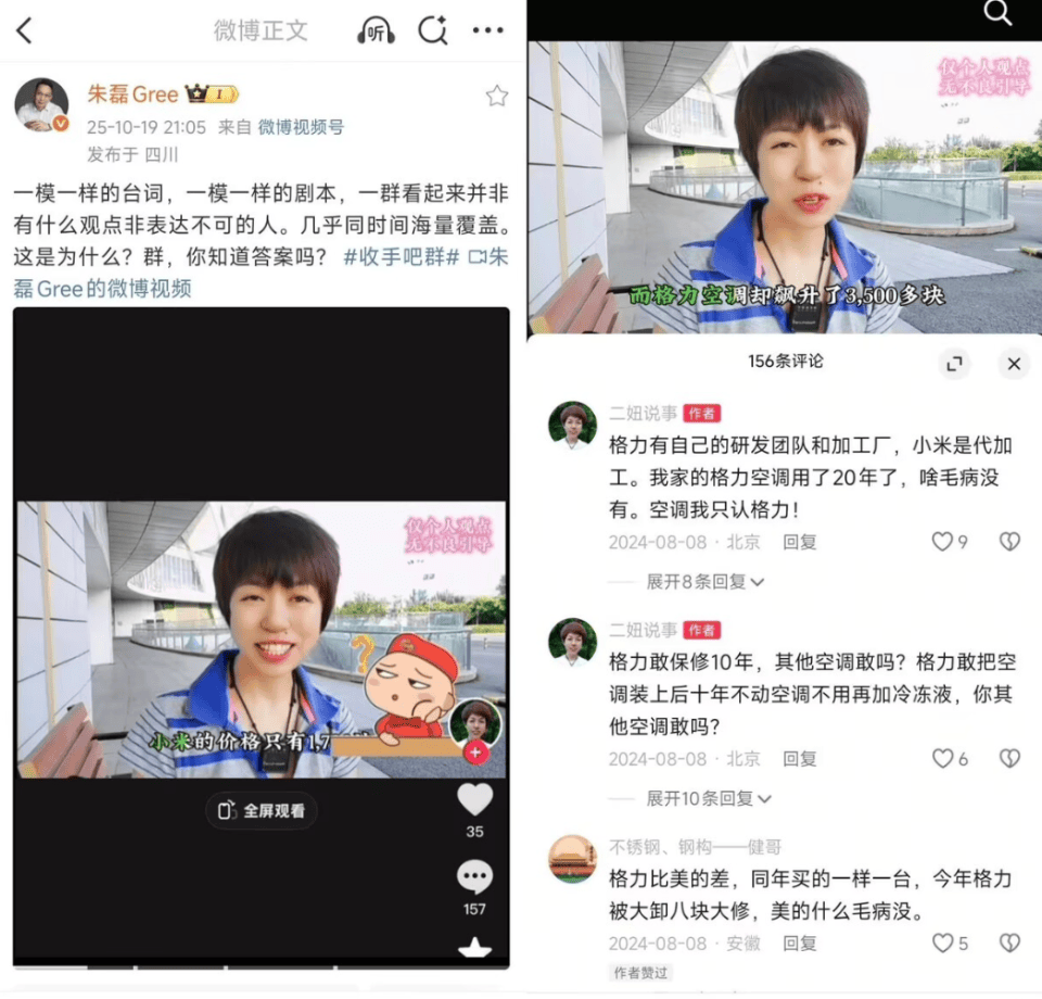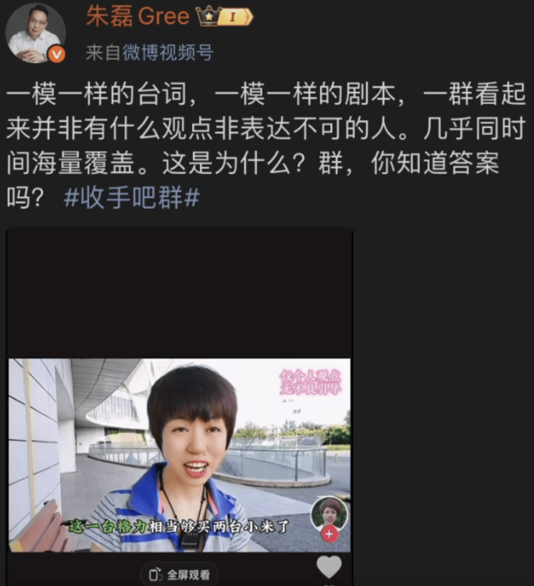 因为就在近日,这位格力高管发现,最近网络上有一堆短视频博主,整天就像复制粘贴一样,齐刷刷地说着同样的台词:?“小米1.5匹空调不到1700,格力要3000多!凭什么!”而且这些内容还在同一时间海量出现。