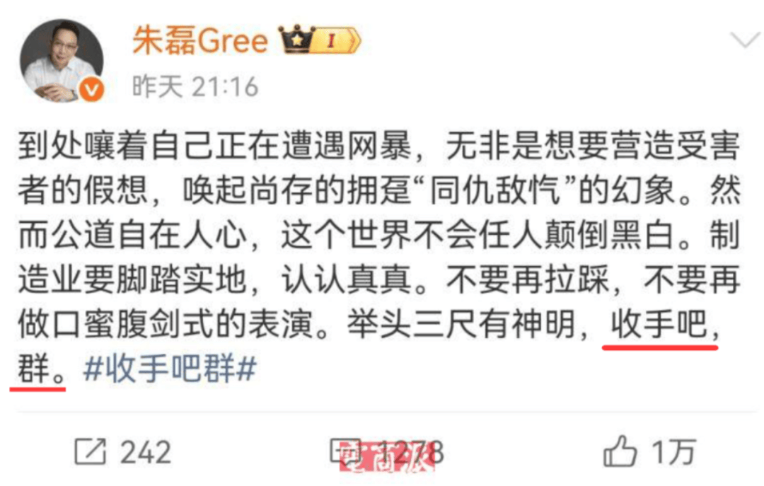 就在昨天,格力的一位高管朱磊,突然在微博上“拍案而起”,连发两条博文,火力全开对准小米的雷军。