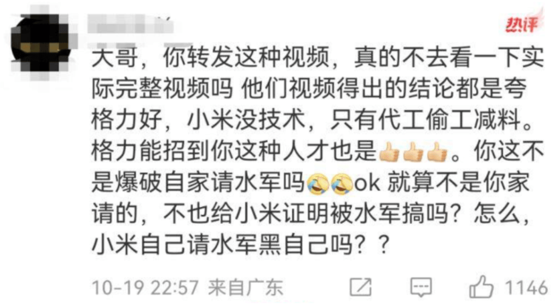 不少尴尬的网友都纷纷给其留言:?“大哥,你看完视频了吗?这是小米的水军吗?这分明是你们自己的水军啊!你这是打董明珠的脸啊!你这翻车的花样也太少见了啊……”