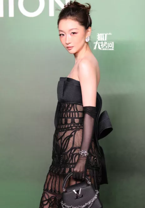 她这一身黑色礼服实在是太大胆了,透肉设计让她的身体若隐若现。