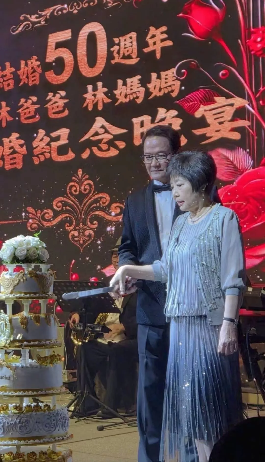 当晚,75岁的林爸爸罕见出现在公众面前,身穿西装,精神状态看起来很年轻。林妈妈打扮得同样得体,两人一同登台切蛋糕,这对携手数十年的夫妻依旧情谊深厚。