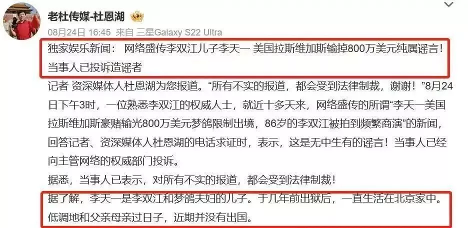2025年7月,网曝著名歌唱家李双江之子李天一输光5800万人民币,为此,梦鸽不得不转移资产,帮助儿子还债,为此还受到了牵连。