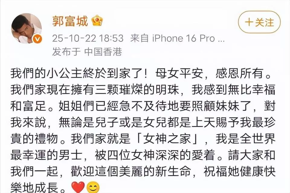 10月22日,郭富城发文宣布三胎生女。