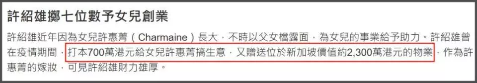 因为老来得女,许绍雄对许惠菁非常宠爱,不仅花钱支持女儿创业,还会给女儿介绍人脉,此前许惠菁的甜品店开业,就请到不少港星助阵。