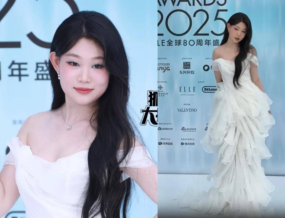 张婧仪的玫瑰金长裙也很优雅,披散的长发和轻薄的妆容平衡了裙子带来的成熟感,所以整体不会有借了姐姐衣服来穿的错觉。