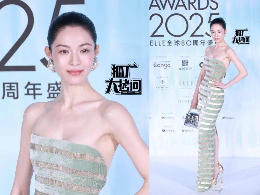 钟楚曦这次的造型同样让人眼前一亮,是一条绿色条纹丝绒抹胸长裙,搭配整齐的盘发和抢眼的大耳环,优雅大气。
