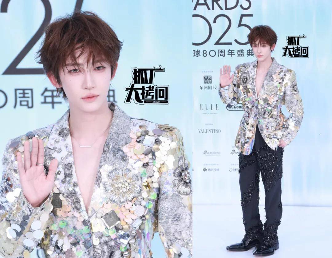 爱豆刘宇全身的衣服都镶满了亮片装饰,妆容比衣服更抢镜——白如纸张的粉底是他的保护色,鼻子上的阴影和高光于他就像鱼儿离不开水,“男版鞠婧祎”名不虚传。