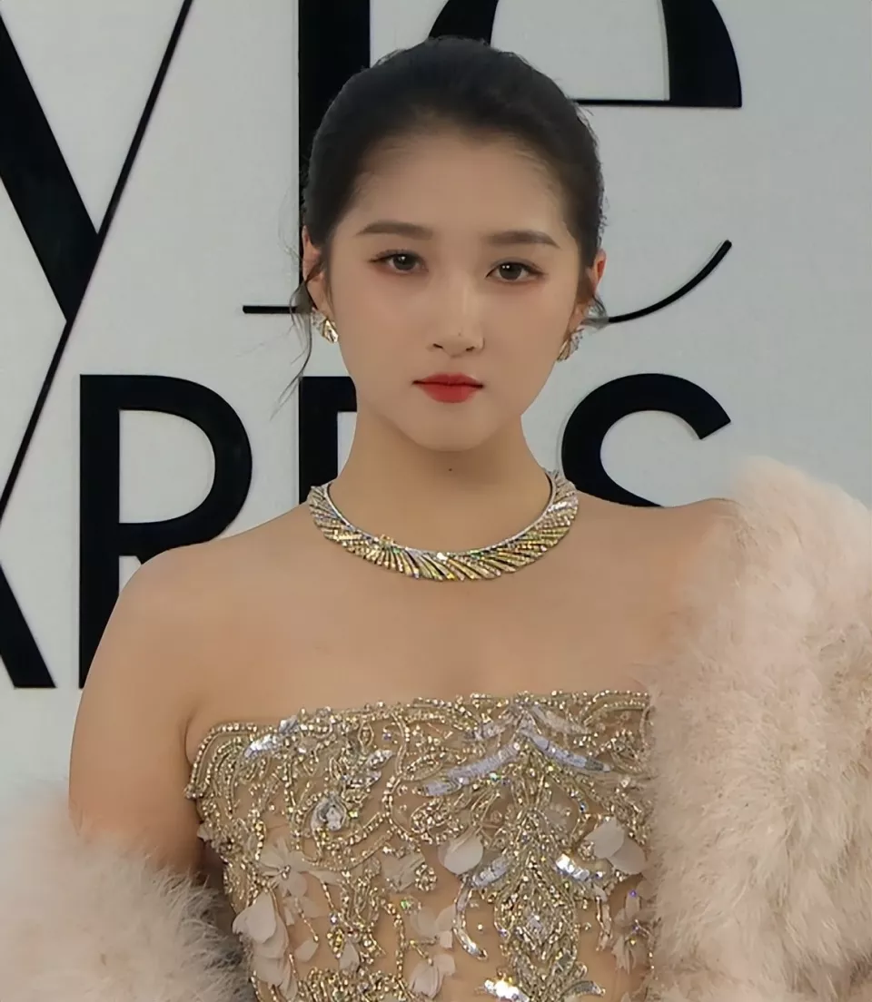 这次选择的香槟蕾丝礼服配粉色毛绒披帛,镜头拉近确实有点惊艳。