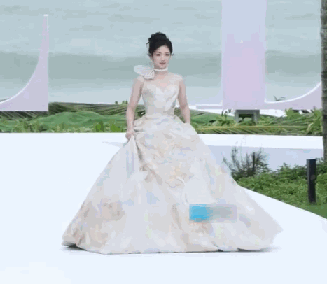 这次团队总算没有延续“微商”风,而是给她选择了蓝色高开叉低胸礼服。