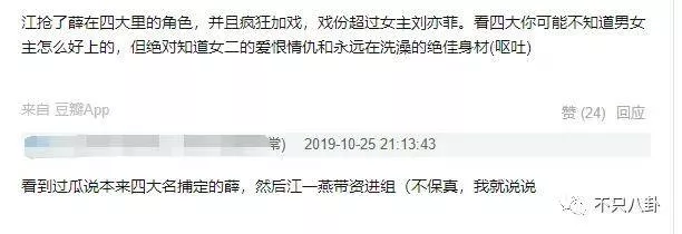 但有网友爆料说,薛凯琪diss江一燕,有传闻是江一燕在《四大名捕》里饰演的“姬遥花”原本属于薛,结果被江半路截胡。这里要强调的是,爆料人说传闻不保真哈。