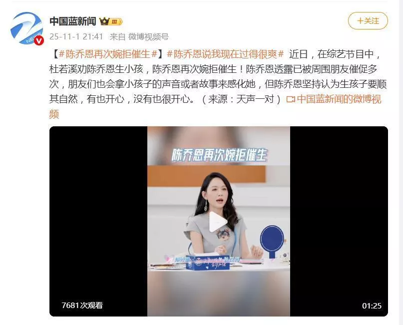 但理解归理解,立场归立场。陈乔恩清晰地划出了自己的界限:她不排斥生孩子,但一切要顺其自然。在她看来,生活是道选择题,而非判断题——“有孩子有孩子的好,没有孩子也是两个人的快乐”。更重要的是,她特别强调了自己当下的满足感:“我现在过得很爽”,即便没有孩子,她同样过得开心自在。