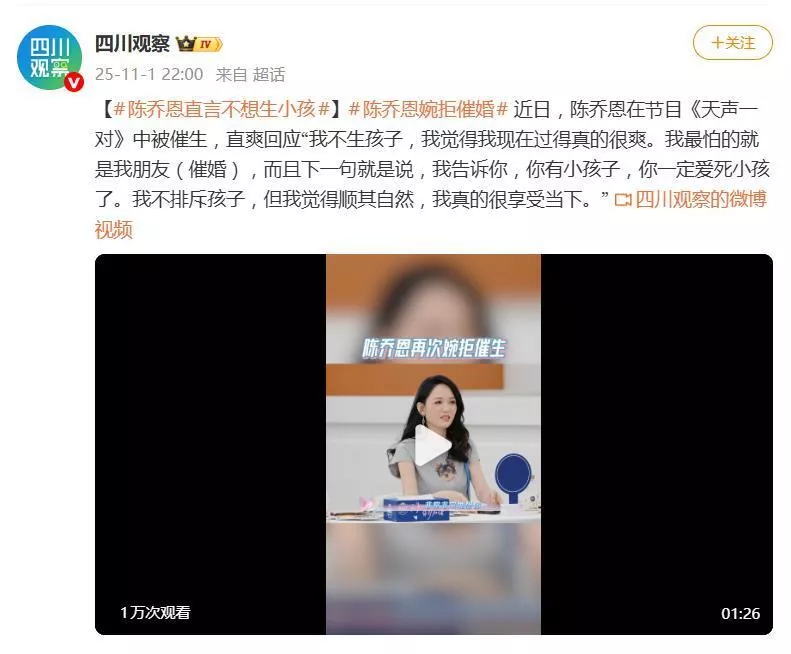 陈乔恩直言"我不生孩子,我现在过得很爽",再次婉拒催生