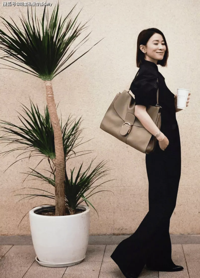 除了裙装,裤装搭配衬衫的造型,也可以驾驭的很利落!她喜欢把衬衫塞进裤子里,打造利落有型的气质,搭配大容量单肩包,一颦一笑,好像都在她的掌握之中!