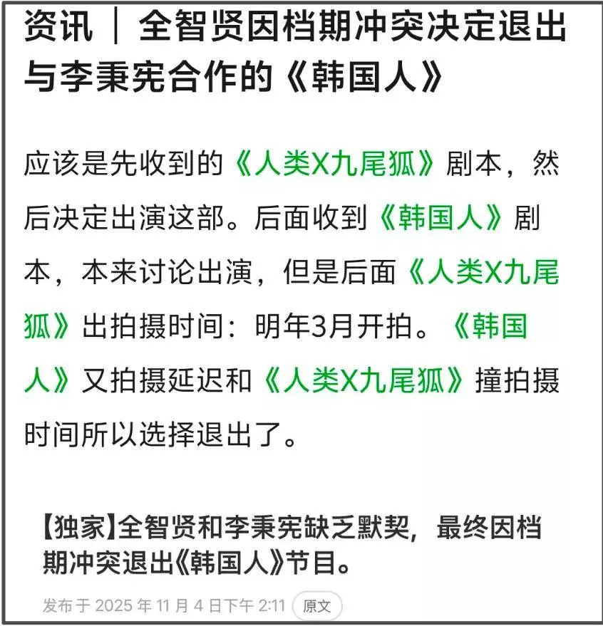 目前《人类X九尾狐》确认了拍摄时间,计划2026年3月开机,而《韩国人》拍摄延迟了,两部剧档期相撞,全智贤选择退出《韩国人》。