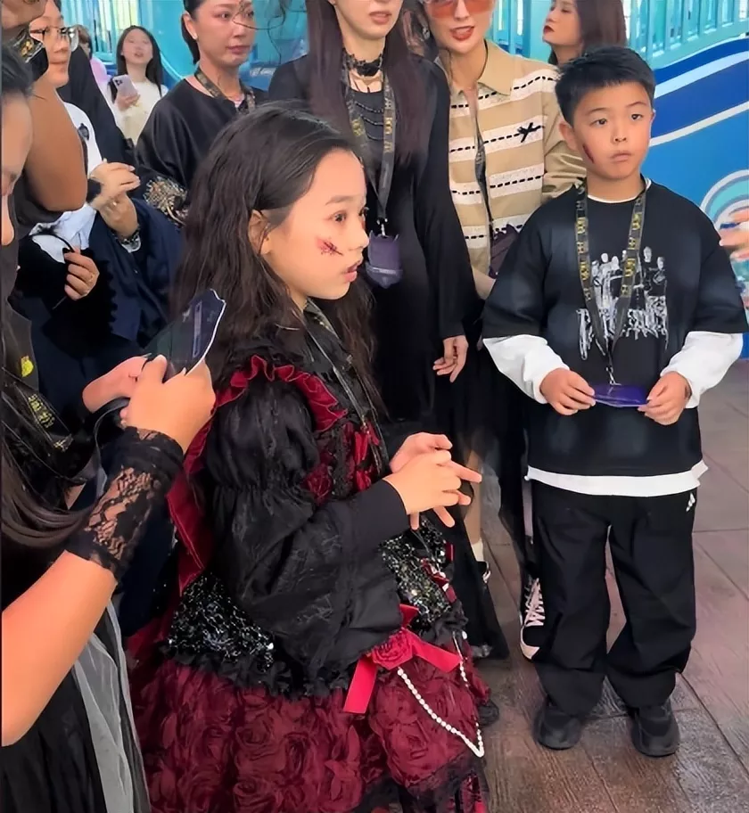 两个孩子更是全程手牵手,小酒窝穿哥特风红黑公主裙像小恶魔,朵朵披着黑斗篷秒变哈利波特,画面温馨得像一家人。