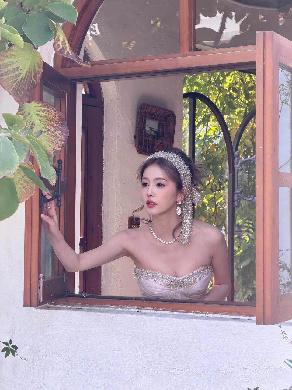她穿了件白色抹胸鱼尾婚纱,头戴水钻发箍,新染的浅棕色长发盘起,露出光洁的额头和修长的脖颈,活脱脱一个中世纪公主。