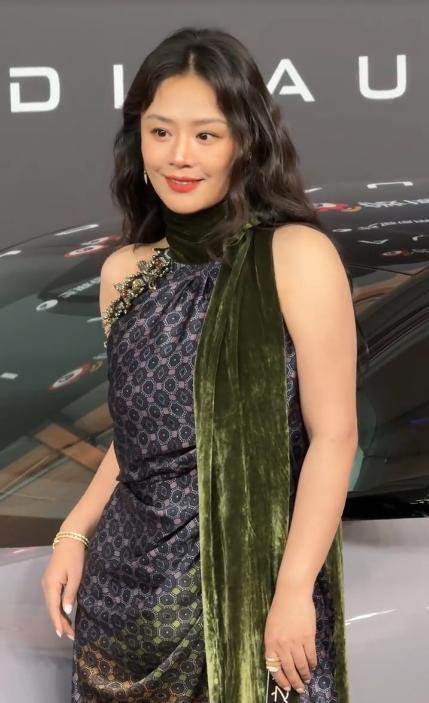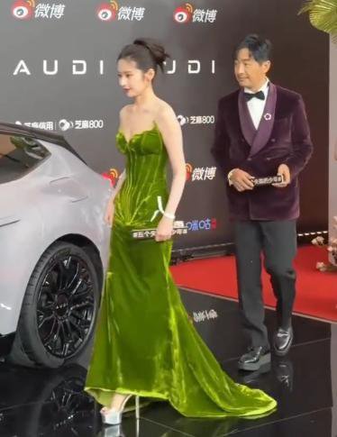 今天红毯穿蓝色挂脖吊带,搭配绿色丝绒围巾,真的好显老,她实在是驾驭不住这两种复古的颜色。