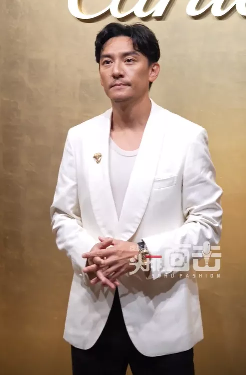 他这一次选择了白色西装,内里搭配了一件微透的汗衫,金黄色的胸针与腕表遥相呼应,配合上张震沉稳又镇静的气场,成年男性的温文尔雅具象化了。
