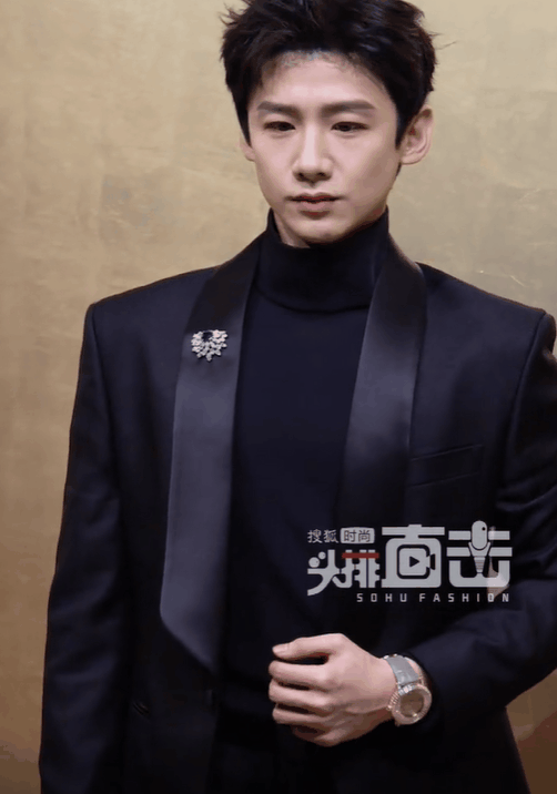 比如白敬亭这身黑色西装搭配同色系高领针织衫,领口处的蓝色钻石胸针冲淡了黑色造型的沉闷感,手腕上银色皮带的腕表同样是点睛之笔。