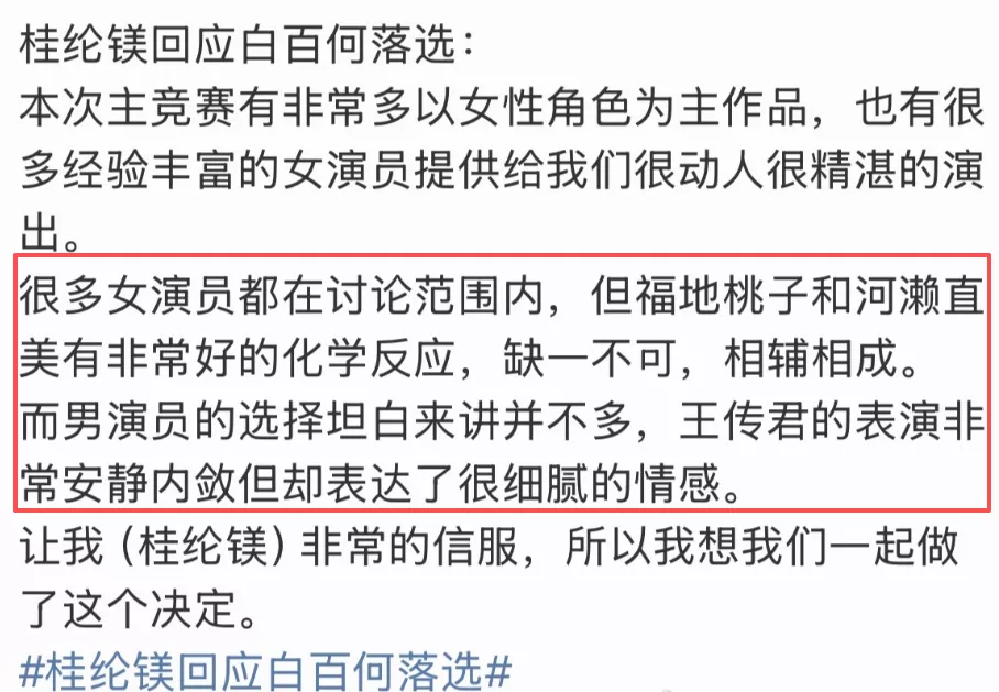 而且身为评委之一的桂纶镁也回应白百何落选,她表示:“很多女演员都在讨论范围内,但福地桃子和河濑直美有非常好的化学反应,缺一不可,相辅相成。”