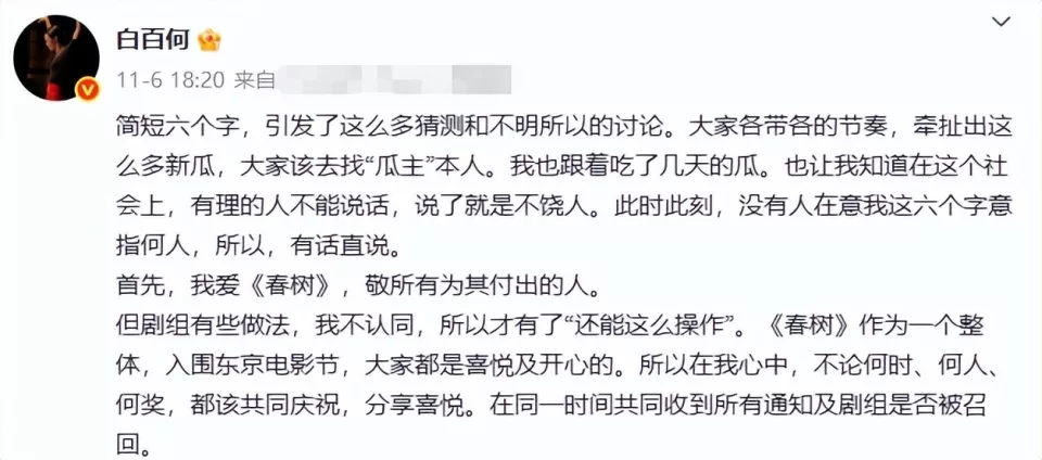 尤其是白百何喊话《春树》剧组的制片、导演这件事,估计比电影正片都要精彩。