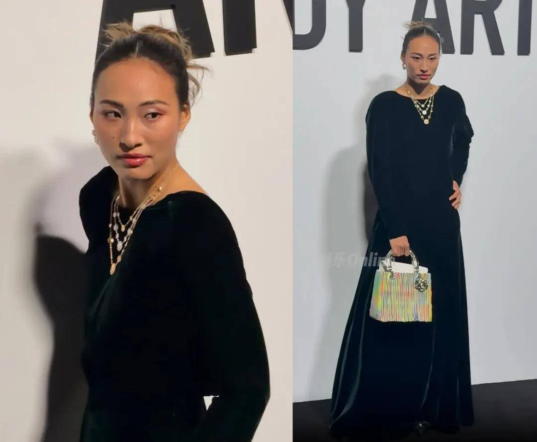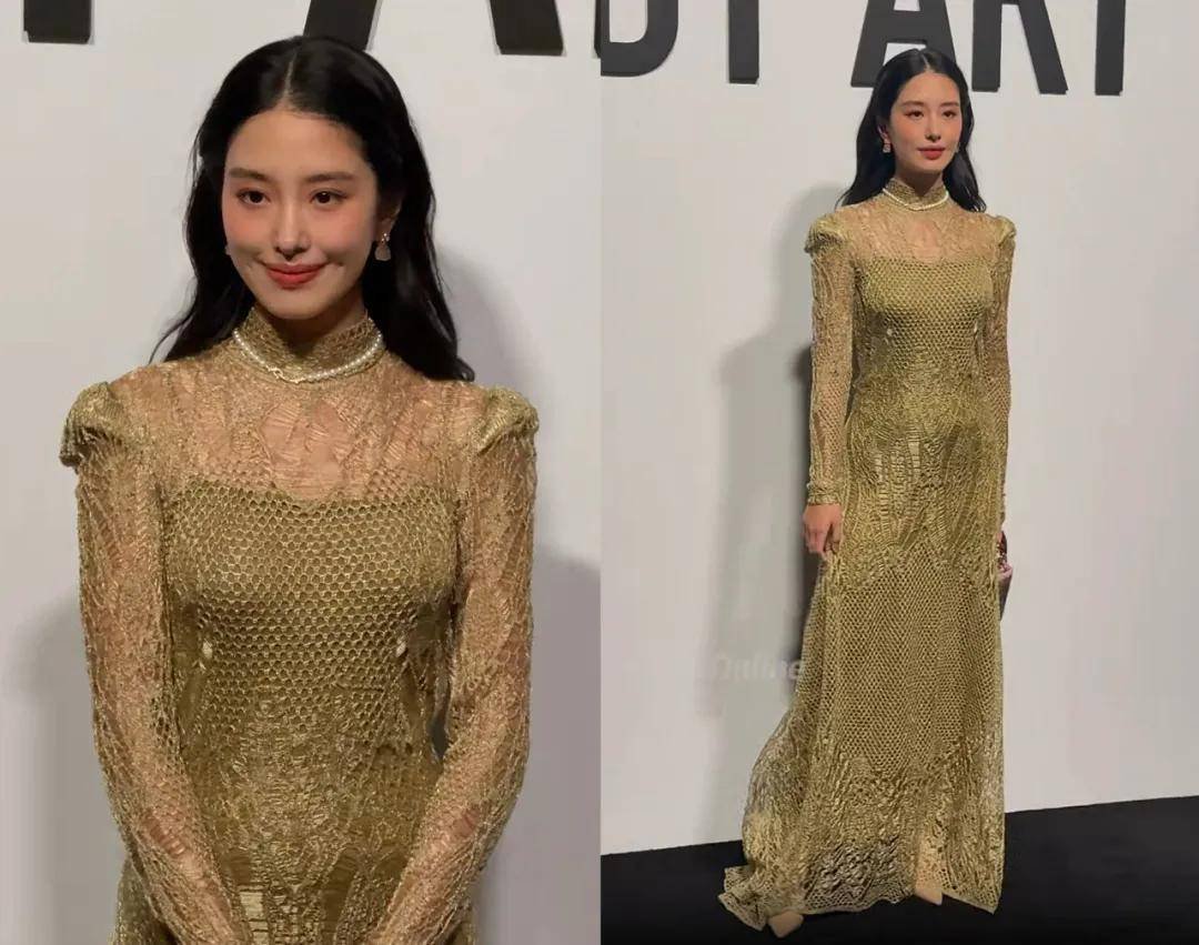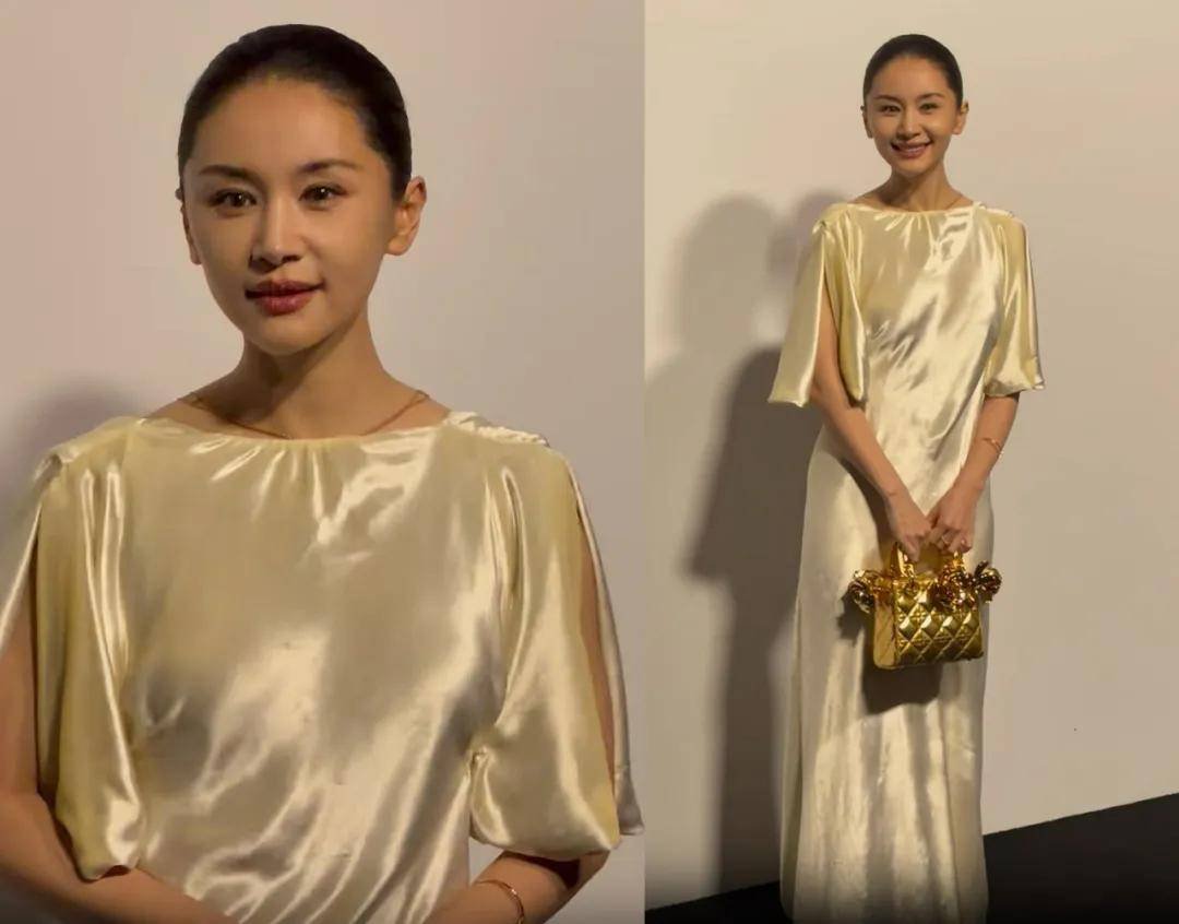 王子文在品牌方的安排下也拿了一只金色的包在身上展示,但这条米白色长裙有点像居家服,看着太普通了,甚至有点拖后腿。每次看她的生图总会感慨她那接近完美的头型,只能说拥有好看的头型和脸型的明星根本不需要什么高颅顶发型、强修容妆容修饰,简简单单就足够好看。她的整体造型,属于人比衣服和包都美。