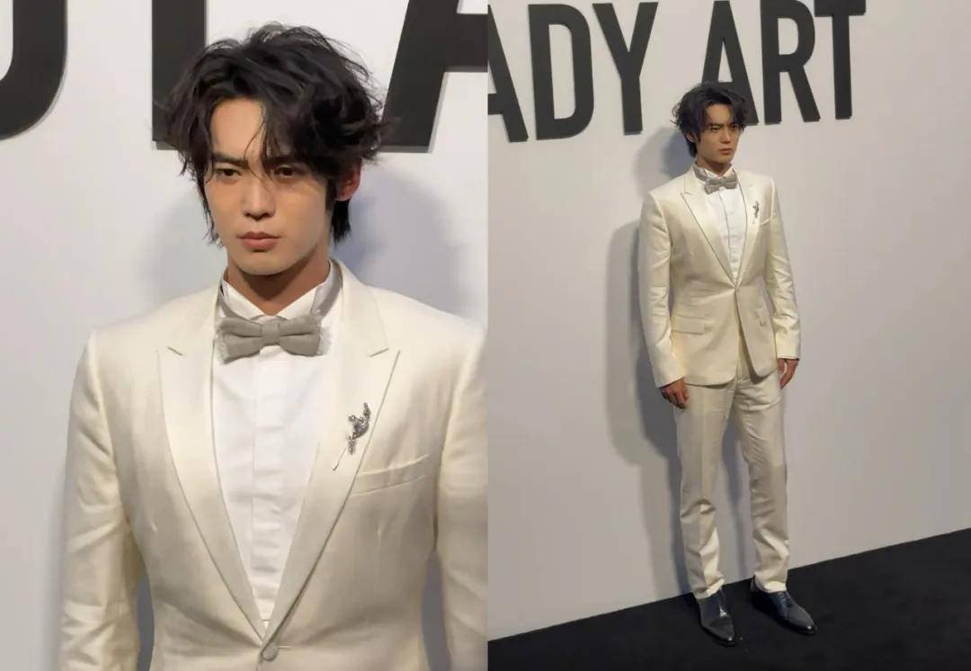 于适穿的是白色西装搭配黑色皮鞋,属于很经典的着装搭配。但他这次的发型是一头蓬松的卷毛,所以看起来优雅中带点活泼。