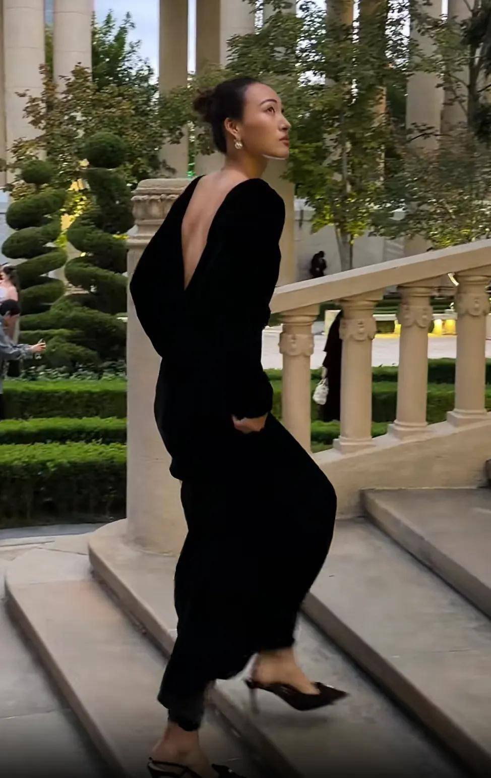 郑钦文所穿的这条黑色丝绒长裙跟王子文的裙子,在设计上有点像,前面看起来平平无奇,后面的露背设计会增加一点高级感。郑钦文毕竟身材高大修长,所以能把普通的黑色礼服穿出十足的气场。