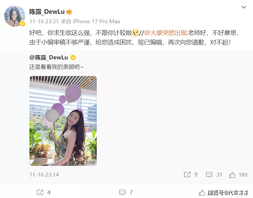 更令人意外的是,陈露不仅直接在造谣博主的评论区留言澄清,迫使对方编辑稿件并道歉,还在与网友互动中透露关键信息:她早已恢复正常生活,取保候审两年间既未被拘留,也未被判刑,案件至今仍处于悬而未决的状态。