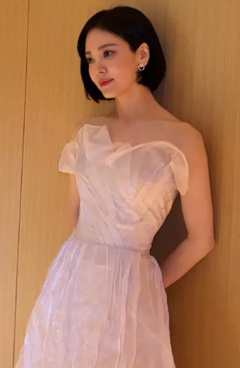 这次宋慧乔选择的是浅粉色抹胸纱裙,锁骨与修长的脖颈格外抢眼,恰到好处的耳坠更显高级。