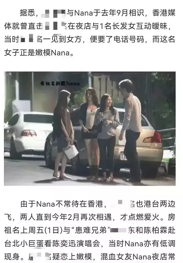 而且最严重的一点是,娜然19岁嫩模时期的名字还是Nana,港媒曾拍到房祖名和陈柏霖看完演唱会时和一众美女约会,其中混血的Nana就在其中,所以如果爆料是真的,娜然年轻时的感情可不比霍启山的少。