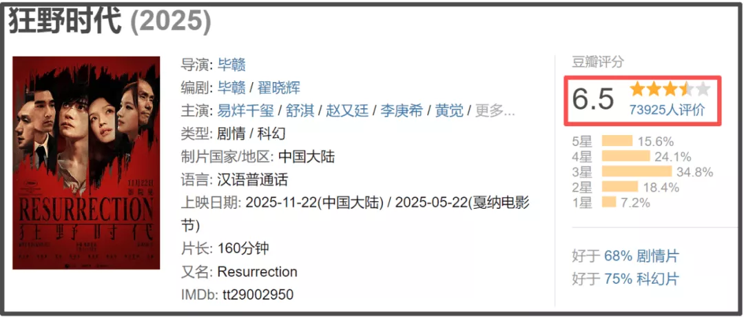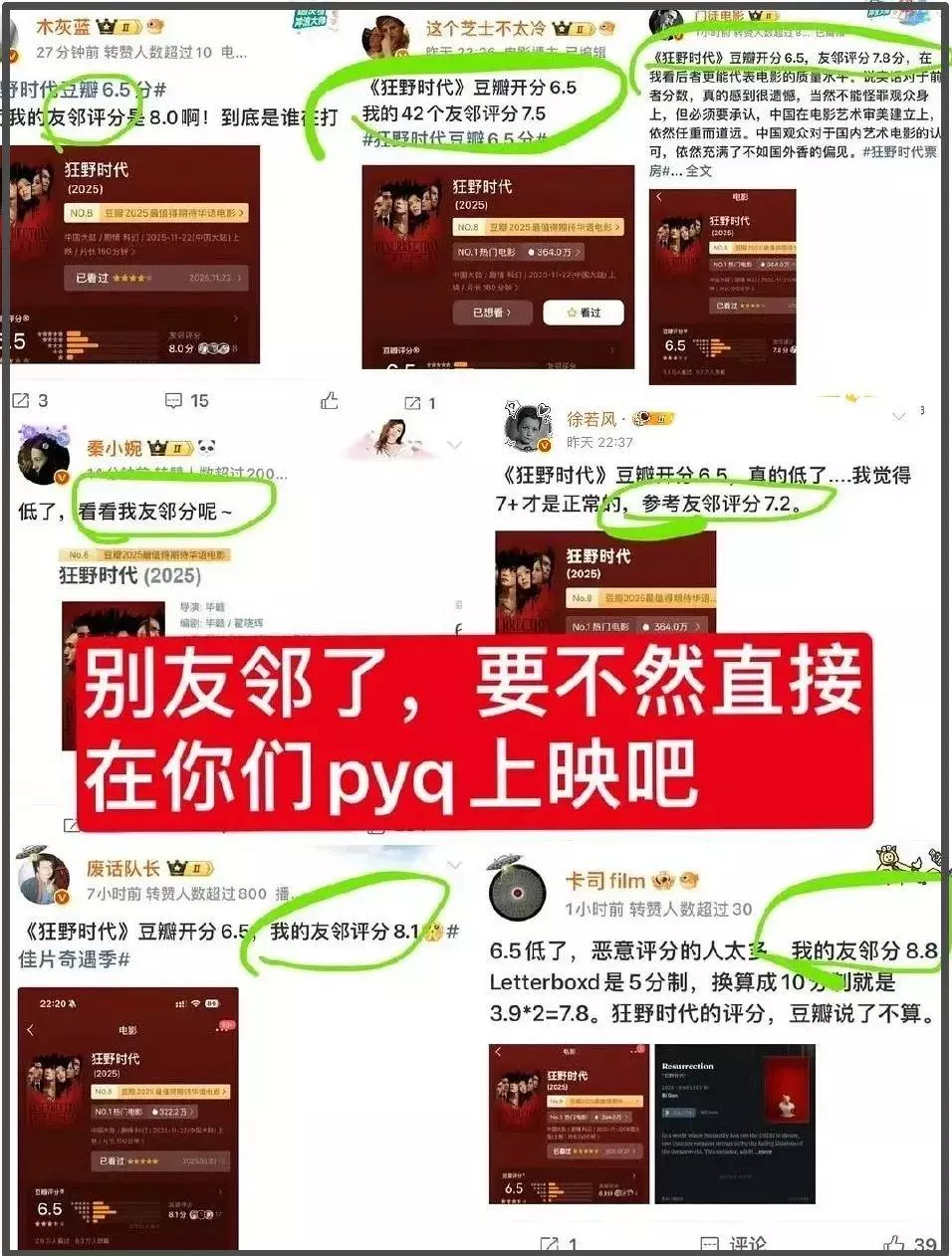 值得一提的是,《狂野时代》的豆瓣评分很快出炉,近8万观众给出了较为客观的评分,6.5分。令人觉得讽刺的是,在豆瓣评分出炉之后,依旧有许多影评人为《狂野时代》摇旗呐喊,不约而同地用高达8分以上的友邻评分为影片打抱不平。对此,网友的态度是“别友邻了,要不然直接在你们的朋友圈上映吧”。