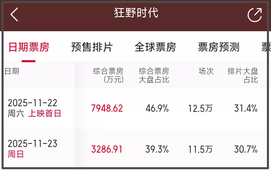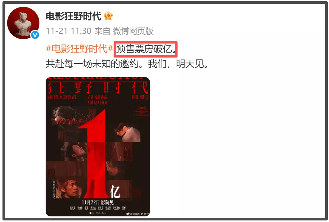 当一部电影的口碑扑街了,它的票房成绩一定会受到极大的影响。《狂野时代》在上映之前预售票房就已经超过了1亿,预售成绩虽然理想,但最终票房如何还是要看影片的质量。
