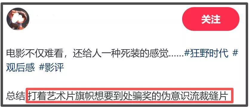从《地球最后的夜晚》到《狂野时代》,毕赣一次又一次地用观众看不懂的内容表达着自己的所谓艺术,这又何尝不是一种高高在上的傲慢。以后除了流量粉丝,谁还会买账?