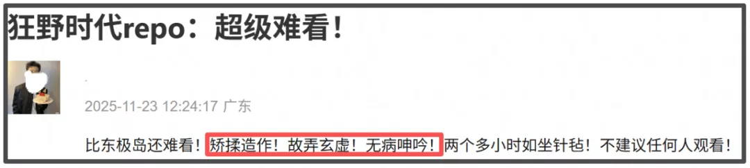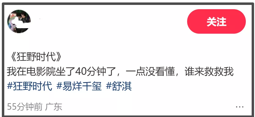 据了解,《狂野时代》上映当天,“《狂野时代》看不懂”的词条就登上了热搜。当越来越多的观众入场,口碑发酵的也越来越快,观众不再保留情面地用“看不明白”等委婉的词汇点评,而是直接将影片定义为烂片。