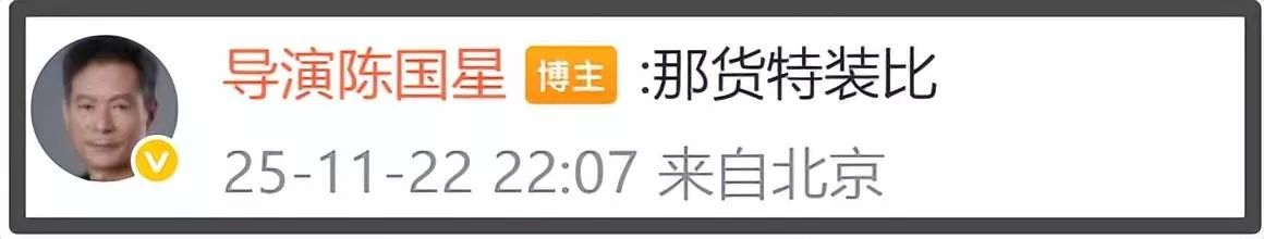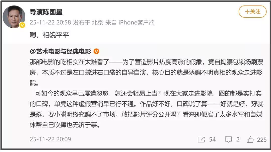 不仅网友对影评人们包装出的营销不满,业内人士对这样的操作同样愤慨,某博主下场直呼“那部电影的吃相实在太难看了,诱骗不明真相的观众走进影院,可如今的观众早已屡遭忽悠,怎还会轻易上当”。之后,导演陈国星转发了这条动态,并且配文内涵称“相貌平平”,还在评论区直言“那货特装”。